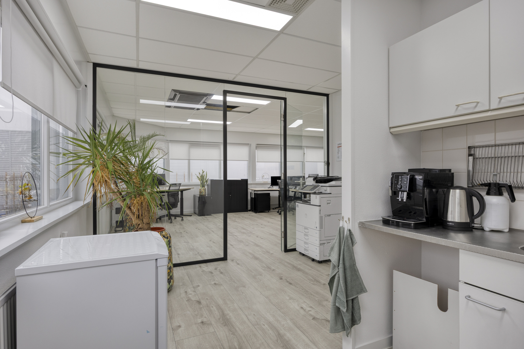 De 1e verdieping is ingericht als kantoorruimte en is voorzien van een pantry en wordt verwarmd middels een centrale verwarmingsinstallatie (cv).